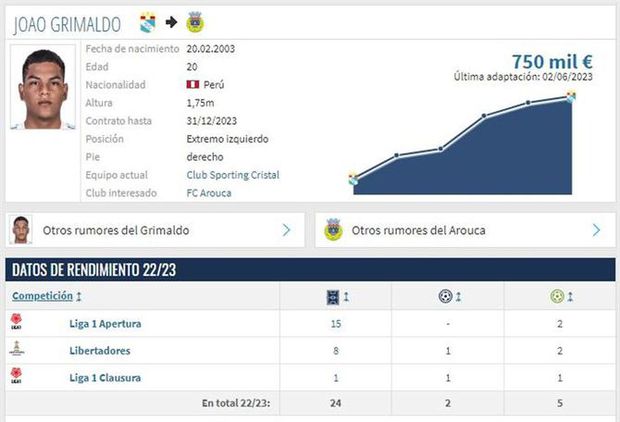 Visto como uma das grandes promessas do futebol peruano, Joao Grimaldo, 20 anos, é um produto da formação do Sporting Cristal e está a fazer a primeira época na equipa principal. Leva 24 jogos disputados pelo clube de Lima, 15 deles como titular, somando entre Liga peruana e Libertadores, dois golos e cinco assistências.