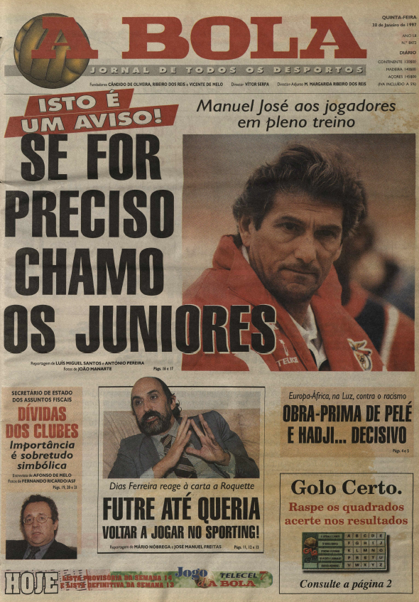 No arranque de 1996/1997, entrou Paulo Autuori. Porém, após três derrotas seguidas (FC Porto, V. Guimarães e Belenenses), a direção de Manuel Damásio decidiu trocar e foi buscar Manuel José ao Marítimo. E logo ao segundo treino, na sequência de ligeira falta de aplicação dos jogadores, o treinador pôs os pontos nos is: «Se for preciso chamo os juniores!»