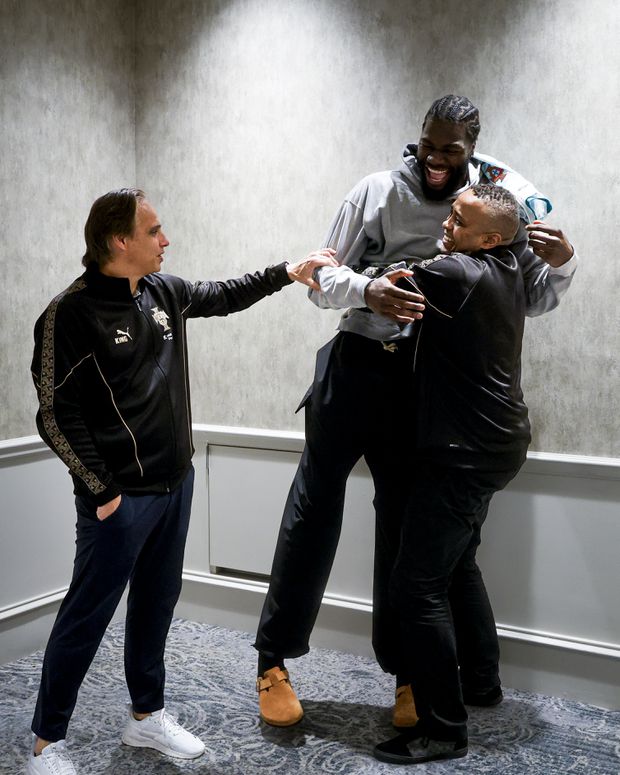 As câmaras da Federação Portuguesa de Futebol apanharam o bom convívio entre as três figuras do desporto nacional, com Jorge Andrade a arriscar-se a levantar o poste de 26 anos, motivando sorrisos entre todos.