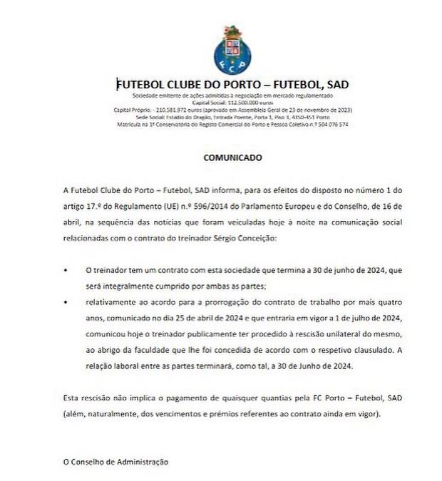 A Futebol Clube do Porto - Futebol, SAD informa, para os efeitos do disposto no número 1 do artigo 17.º do Regulamento (UE) n.º 596/2014 do Parlamento Europeu e do Conselho, de 16 de abril, na sequência das notícias que foram veiculadas hoje à noite na comunicação social relacionadas com o contrato do treinador Sérgio Conceição:
