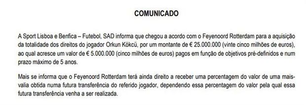 No comunicado, as águias esclarecem ainda que o campeão neerlandês fica com direito ao valor da mais-valia obtida numa futura transferência de Kokçu, sendo que esse valor dependerá do montante da operação.