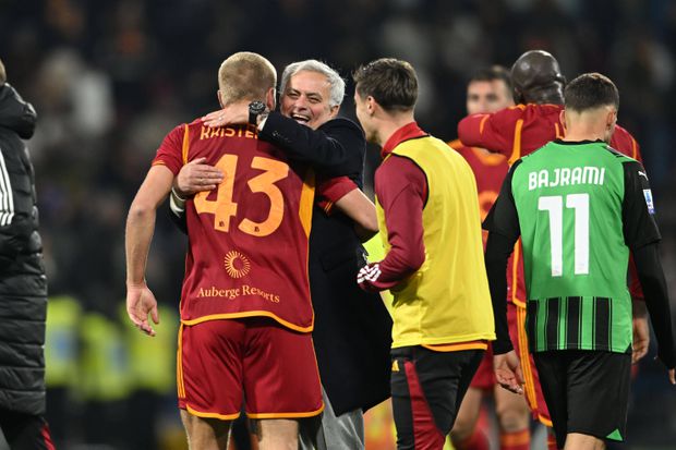 José Mourinho a abraçar Rasmus Kristensen, após uma vitória da Roma ao Sassuolo