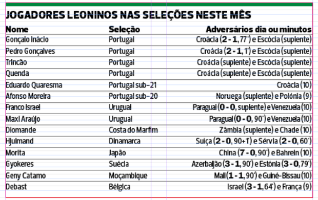 Essa valorização surge na sequência de um crescimento da equipa leonina que culminou com a conquista do título na época passada. Com efeitos positivos em termos internacionais, pois daquele onze internacional: Israel, Eduardo Quaresma, Diomande, Gonçalo Inácio, Geny Catamo, Hjulmand, Morita, Maxi Araújo, Trincão, Gyokeres e Pedro Gonçalves, por exemplo, seis deles — à exceção de Israel, Eduardo Quaresma, Diomande, Trincão e Pedro Gonçalves —todos tiveram na primeira ronda de jogos de seleções estatuto de titulares. Falamos de Gonçalo Inácio, Geny Catamo, Hjulmand, Morita, Maxi Araújo e Gyokeres. Os seis que somaram mais minutos, os seis que, curiosamente, foram venceram os jogos da primeira bateria de jogos de seleção que prosseguem até à próxima quarta-feira, dia em que Franco Israel e Maxi Araújo, jogam pelo Uruguai na Venezuela, às 23 horas portuguesas. A dupla sul-americana será, assim, a última a regressar à Academia para preparar a deslocação a Arouca marcada para a próxima sexta-feira.