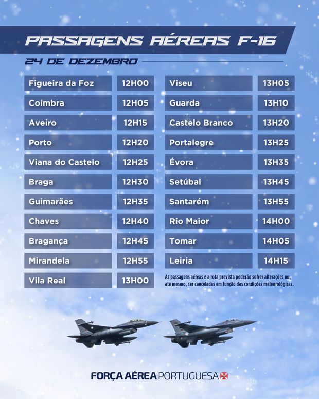 Uma parelha de caças F-16 da Força Aérea vão sobrevoar algumas regiões de Portugal no dia 24 de dezembro, uma forma de a Força Aérea desejar Feliz Natal.