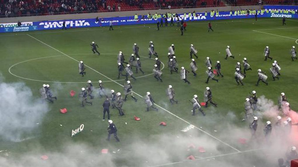 O Olympiakos-AEK Atenas, na noite de domingo, terminou descontrolado, com invasão de campo e confrontos com a polícia.