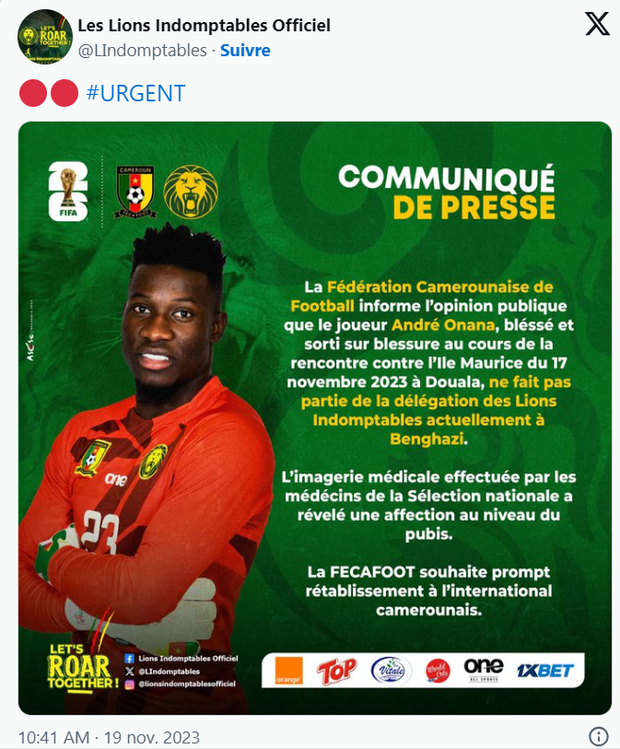 A federação dos Camarões anunciou, este domingo, a dispensa do guarda-redes André Onana, devido a lesão, estando, assim, afastado do jogo da próxima terça-feira, contra a Líbia, na fase de qualificação para o Mundial-2026.