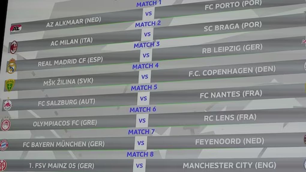 Recorde o sorteio: Mainz-Manchester City; Bayern-Feyenoord; Olympiakos-RC Lens; Salzburgo-Nantes; Žilina-Copenhaga; Real Madrid-Leipzig; AC Milan-SC Braga e AZ Alkmaar-FC Porto.