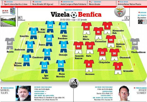 Os onzes prováveis do Vizela-Benfica