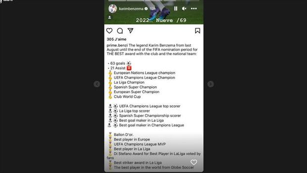 O Real Madrid não marcou presença nos prémios The Best da FIFA, que consagraram Lionel Messi e a seleção da Argentina. Karim Benzema, atual Bola de Ouro, ficou em terceiro, atrás de Kylian Mbappé, e mostrou o seu desagrado através de várias mensagens nos stories do Instagram.