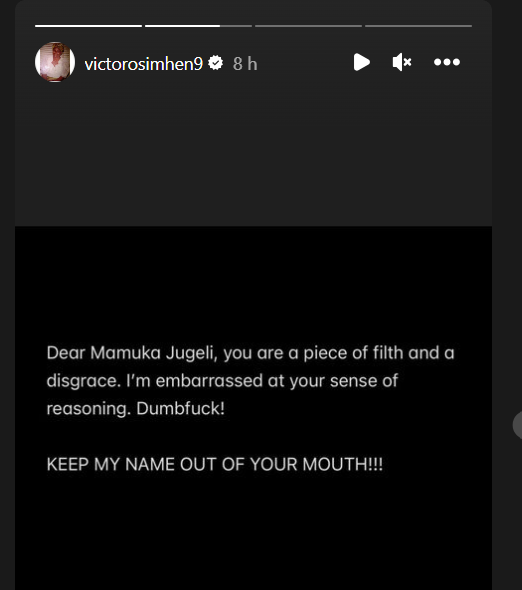 Entretanto, o empresário de Osimhen, Roberto Calenda, divulgou um comunicado sobre as referidas declarações de Mamuka Jugel: «Cada um deve olhar para a sua casa e respeitar o trabalho dos outros. Não é correto falar do futuro de outros jogadores. Isso cria mal-entendidos e problemas, bem como previsões infelizes. As supostas palavras do agente Mamuka Jugeli são ruins, superficiais e inaceitáveis. Essas palavras criam problemas para o meu jogador Victor Osimhen junto dos adeptos do Nápoles sem qualquer razão ou realidade. Acabámos de assinar a renovação do contrato e o único desejo do Victor, além do Campeonato das Nações Africanas, é ajudar o Nápoles. Tudo o resto é lixo.»