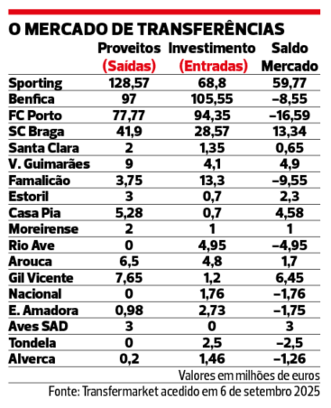 O mercado português de transferências de jogadores de futebol profissional da Liga Portugal deste verão apresentou a maior diferença entre investimento — compra — e proveitos — venda — dos últimos três anos e um acentuado desequilíbrio entre os três primeiros classificados e o quarto, e destes para os restantes 14 clubes.