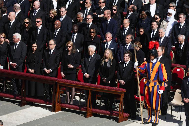 Essa cerimónia foi oficiada pelo cardeal Giovanni Battista Re e nela marcaram presença chefes de Estado e Governo de todo o mundo. Portugal fez-se representar pelo Presidente da República, Marcelo Rebelo de Sousa, pelo Presidente da Assembleia da República, Aguiar Branco, pelo Primeiro-ministro, Luís Montenegro e pelo Ministro dos Negócios Estrangeiros, Paulo Rangel. Marcelo Rebelo de Sousa ficou sentado na segunda fila, imediatamente atrás de Donald Trump, presidente dos Estados Unidos.