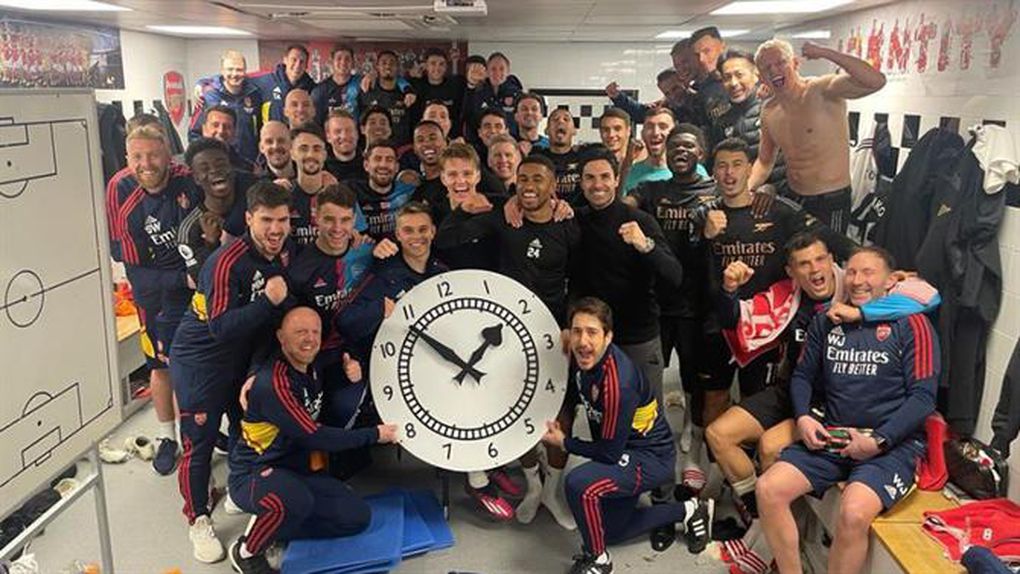 Na imagem, a equipa posa para a fotografia no balneário do Craven Cottage, estádio do Fulham, após vitória por 3-0, anteontem, que permitiu manter os cinco pontos de avanço sobre o Manchester City no topo da Premier League. Em grande plano está uma réplica do famoso relógio que esteve no Estádio Highbury durante mais de 70 anos e que sobreviveu à mudança para o Emirates, em 2010 - o original foi instalado no exterior do novo estádio e uma réplica, maior, foi colocada numa das bancadas, que ganhou o nome de Clock End, ou Topo do Relógio.