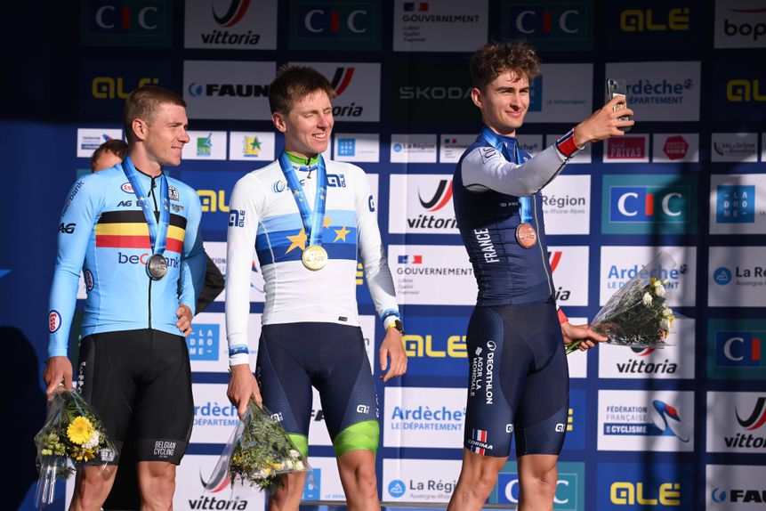O jovem Paul Seixas, que, aos 19 anos, apenas foi batido pelos dois grandes candidatos ao título - Pogacar e Evenepoel - conquistou uma improvável medalha de bronze, confirmando o desempenho nos Mundiais de estrada, nos quais foi o melhor representante francês, ao terminar no 13.º lugar.