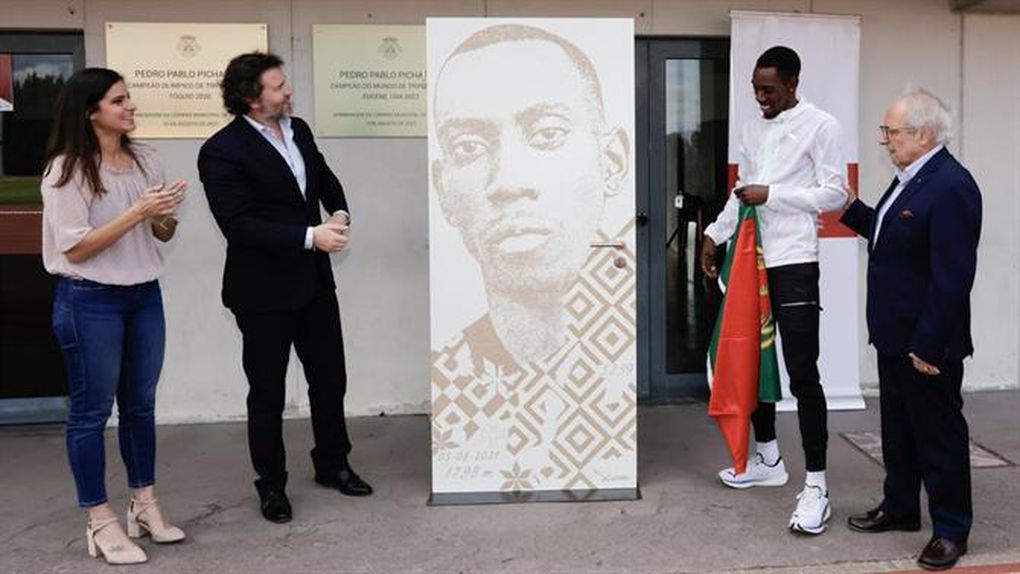 O atleta luso-cubano, medalha de ouro no triplo salto em Tóquio no ano passado, recebeu a porta de homenagem, uma peça artística da autoria de Telmo Guerra que distingue os portugueses que conquistaram o ouro nos Jogos Olímpicos.