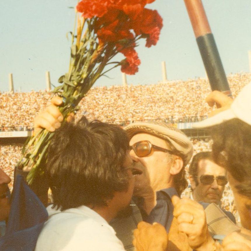 Uma foto de José Maria Pedroto com cravos na mão, em festa, ilustra a homenagem do FC Porto ao 25 de Abril, que esta sexta-feira festeja 50 anos.