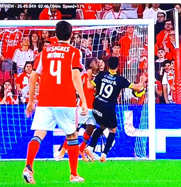 36 O VAR chama o árbitro para lhe mostrar inicialmente uma imagem parada onde a bola está a tocar no braço/cotovelo direito de Afonso Rodrigues. Como o braço está levantado e ligeiramente afastado do corpo dá margem para de forma objetiva se dizer que está em posição não natural. Mas a questão é que a dinâmica da jogada, mostra outra realidade, há um cabeceamento de Leandro Barreiro em cima do adversário, com a bola a um metro de distancia, ou seja, um cabeceamento à queima, tecnicamente designado de bola inesperada. O jogador é surpreendido, havendo quase em simultâneo um choque entre ambos, tal era a proximidade. Na minha opinião e neste lance em concreto, acho que o futebol não espera que um penálti seja assinalado nestas circunstâncias. Dou como incorreta a decisão de se ter assinalado pontapé de penálti.