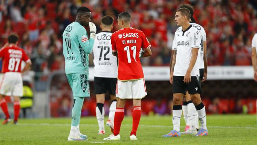 Nuno Almeida marcou grande penalidade por suposto braço na bola de Afonso Freitas após centro de Di María mas, chamado pelo VAR, viu as imagens e reverteu a decisão.