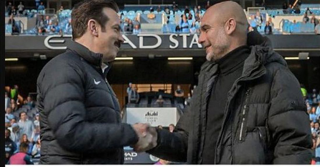 O treinador do City faz o seu próprio papel, claro, e tem direito a fala e tudo ao trocar um cumprimento com o protagonista, Ted Lasso, treinador americano da equipa fictícia AFC Richmond, que disputa a Premier League.