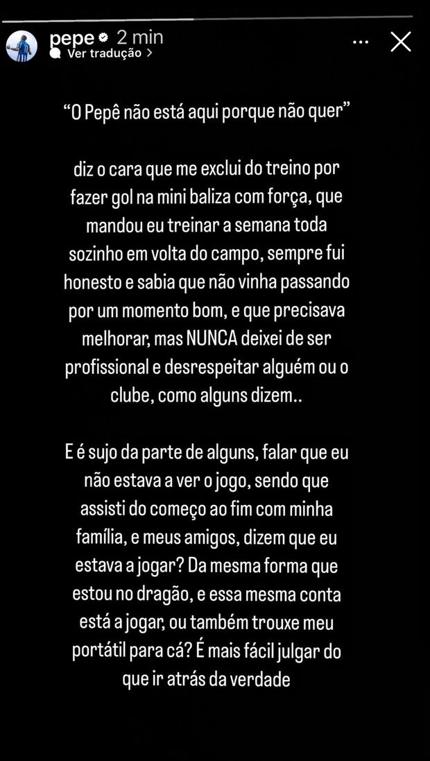 Pepê reagiu, através da rede social Instagram, às acusações de Vítor Bruno, explicando o desentendimento que teve com o treinador e que o levou a ficar fora do jogo com o Gil Vicente, perdido pelos dragões, por 1-3.