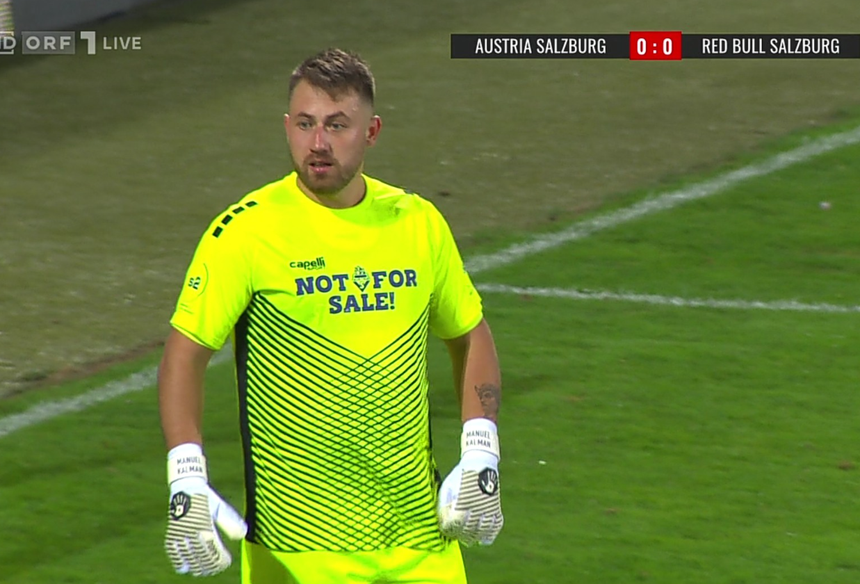 SV Austria Salzburg at home to the drinks company which stole their club in the Austrian Cup last night, goalkeeper Manuel Kalman wearing a “not for sale” kit.