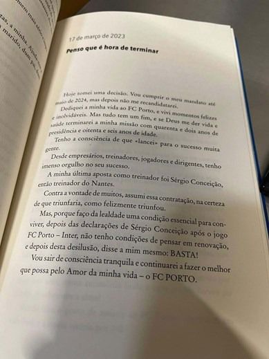 No livro que vai apresentar no próximo domingo, na Alfândega do Porto, Pinto da Costa revela que em 2023 decidiu que não renovaria mais com Sérgio Conceição, explicando que a mesma decisão se ficava a dever às declarações do treinador após o FC Porto-Inter, que ditou o afastamento portista nos oitavos de final da Liga dos Campeões 2022/23. «Mas, porque faço da lealdade uma condição essencial para conviver, depois das declarações de Sérgio Conceição após o jogo FC Porto-Inter, não tenho condições de pensar em renovação, e depois desta desilusão, disse a mim mesmo: BASTA!», lê-se na passagem referente ao dia 17 de março de 2023.