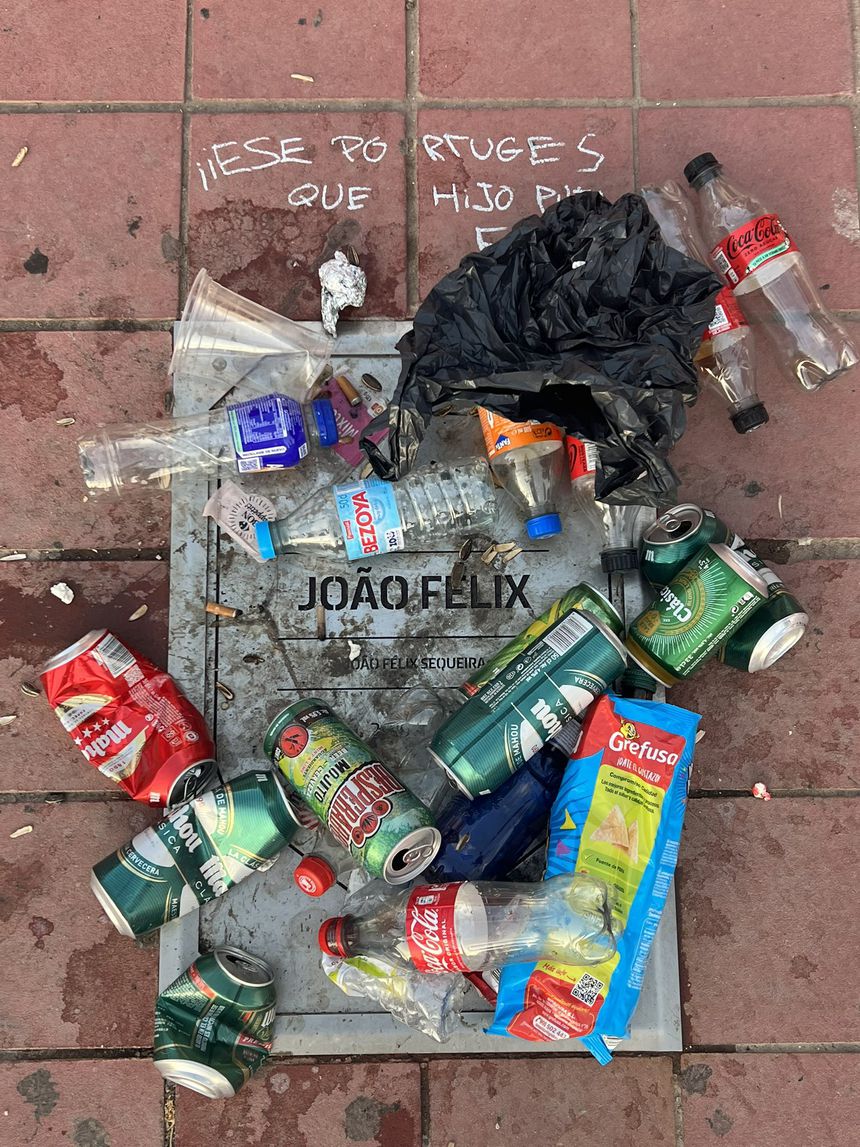 Numa fotografia publicada pelo jornalista Rodrigo Fáez, é possível ver a placa de João Félix cercada por lixo. Além disso, escrita no chão, perto da placa, está uma mensagem insultuosa para o avançado.
