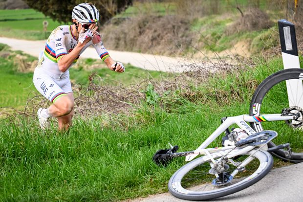 Pogacar cai mas arrasa na Strade Bianche: «Adrenalina passou e agora é só dor»