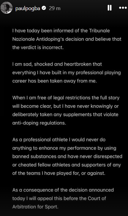 «Fui hoje informado da decisão do Tribunal Nacional Antidoping e acredito que o veredicto é incorreto. Estou triste, chocado e de coração partido por tudo o que construí na minha carreira de jogador profissional me ter sido retirado», começa por referir o médio francês, numa publicação partilhada no Instagram.