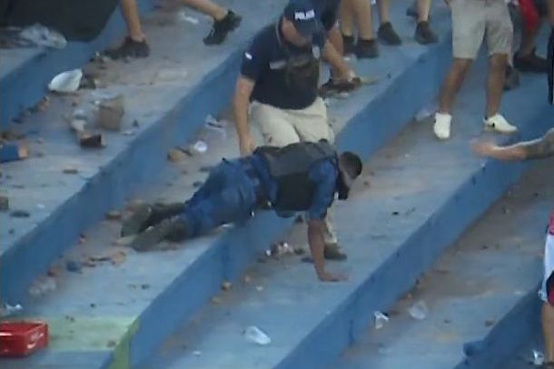 Terrible esto. Momento exacto en donde un efectivo de los casco azules cae totalmente sin fuerzas y prácticamente inconsciente, ayudado por otro policia de eventos deportivos y algunos miembros de la barra brava de Cerro Porteño.