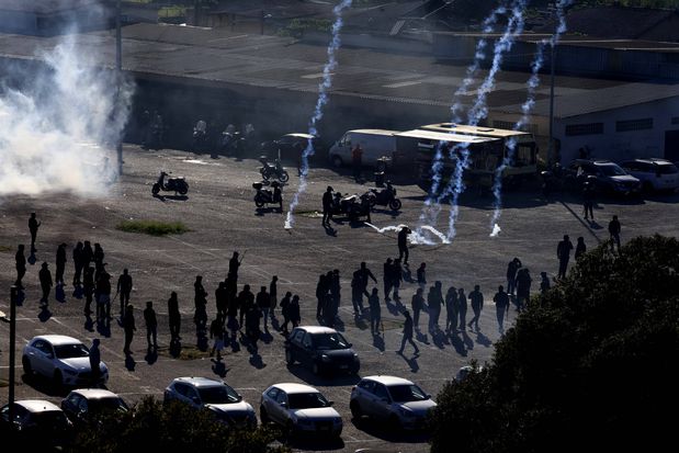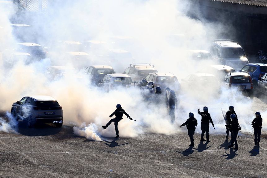 As claques encontraram-se no estacionamento do estádio e atiraram foguetes, fogo de artifício e pedras, com a polícia italiana a intervir com gás lacrimogéneo para interromper o confronto.