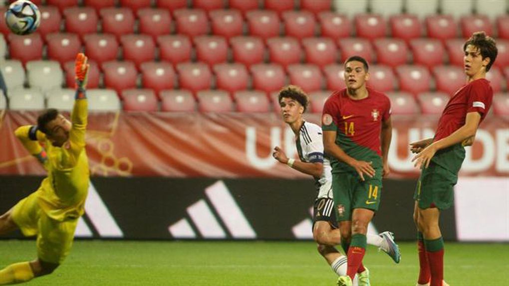 32 minutos: Golo da Alemanha! Erro de Rayhan Momade, que perde a bola em zona proibida, e Noah Darvich, depois de entrar na área, ligeiramente descaído para o lado direito, a rematar de pé esquerdo para o fundo das redes de Gonçalo Ribeiro. 0-1.