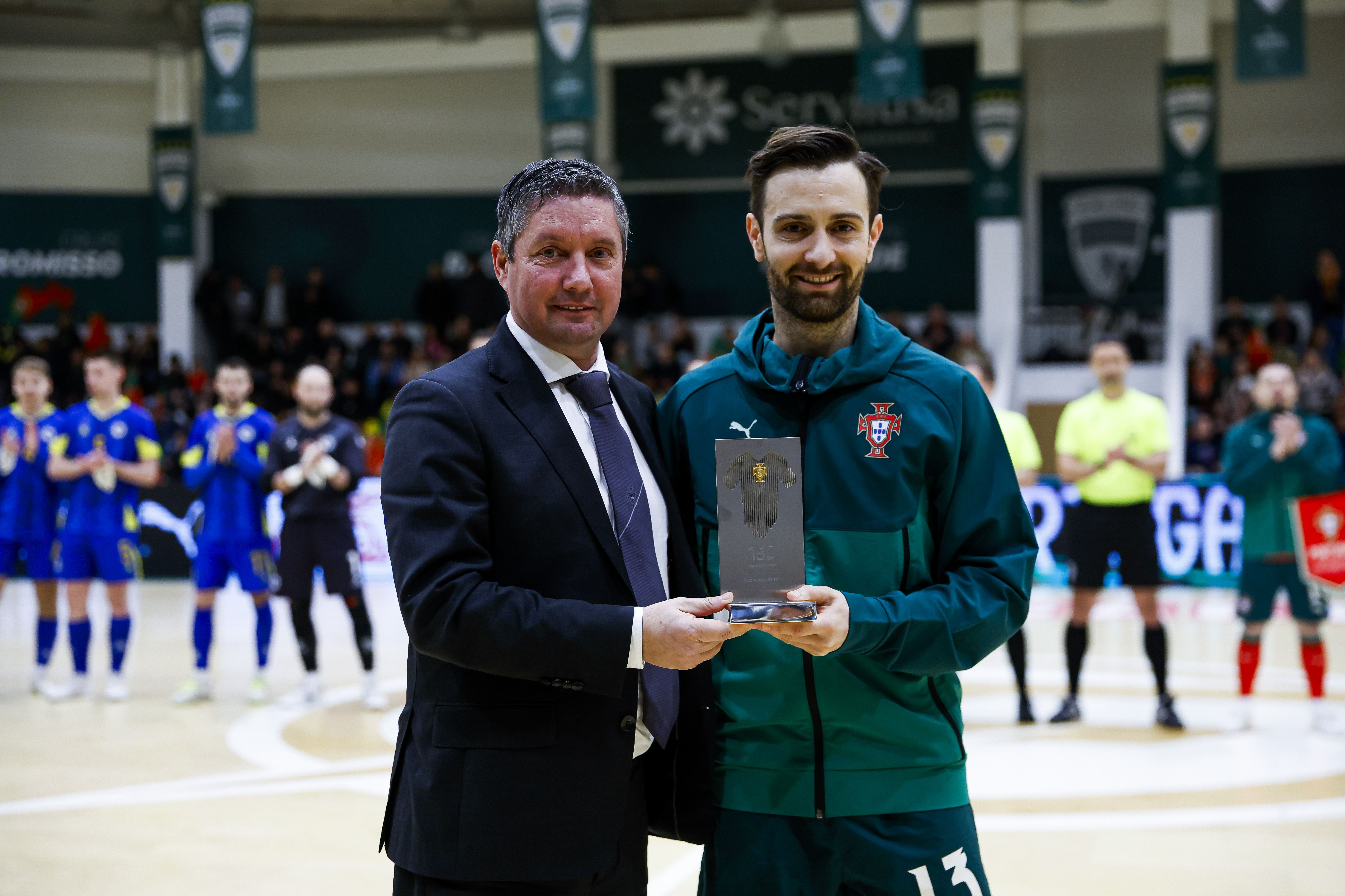 Tiago Brito recebeu placa dos 150 jogos de quinas ao peito, marcou um golo e fez uma assistência - Foto: FPF