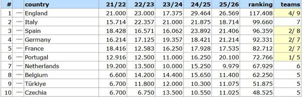 A qualificação do SC Braga para as meias-finais da UEFA Europa League, aliada à eliminação do AZ Alkmaar aos pés do Shakhtar Donetsk nos quartos da Conference League, permitiu que Portugal cimentasse o sexto lugar e aumentasse a vantagem no ranking da UEFA em relação aos Países Baixos, principal perseguidor.