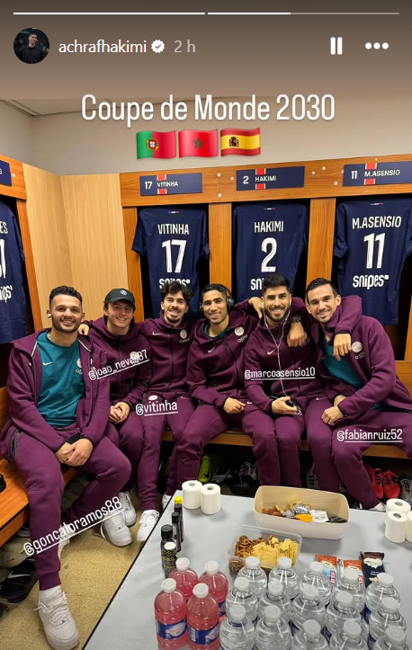 Hakimi partilhou fotografia nas redes sociais com Gonçalo Ramos, João Neves, Vitinha, Marco Asensio e Fabián Ruiz. Portugal, Espanha e Marrocos recebem o Mundial 2030