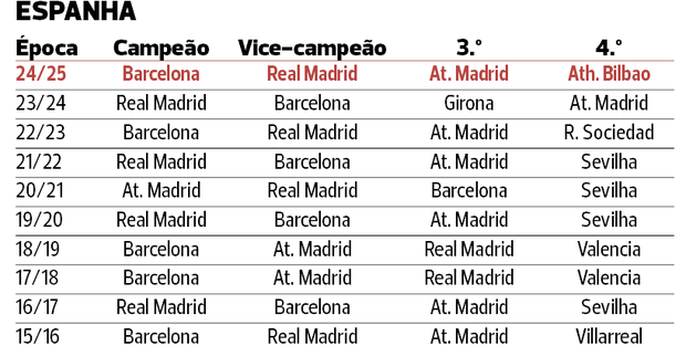 O Athletic Bilbao é quarto classificado na La Liga e a oito pontos de Barcelona e Real Madrid e a quatro do Atlético Madrid. Muito complicado que os bascos repitam as históricas épocas de 1982/1983 e 1983/1984 e que haja um campeão fora dos três dos últimos dez anos.
