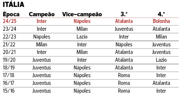 Juventus, Inter, Milan e Nápoles venceram a Serie A nos últimos dez anos. Embora menos evidente, não parece crível que seja agora que a Atalanta faça o que nunca fez: ganhar a Liga. Tem seis pontos de atraso para o Inter e três para o Nápoles e não deverá ser desta que a equipa de Bérgamo será campeã.