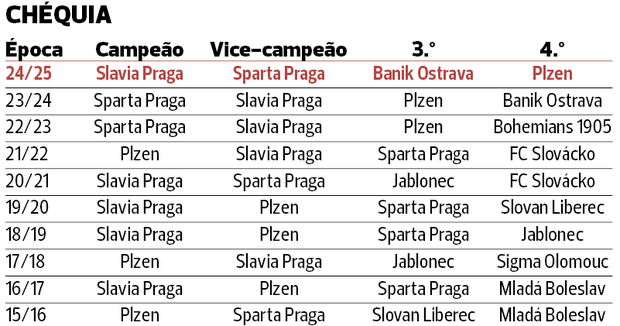 Na Chéquia, só três foram campeões desde 2015/2016: Sparta de Praga, Slavia de Praga e Plzen. O Slavia tem 14 pontos de avanço sobre o Banik Ostrava a quatro jornadas do fim do campeonato, logo impossível haver campeão diferente.