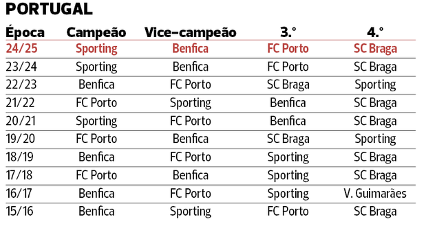 Por cá, Benfica venceu quatro Ligas, FC Porto mais duas e Sporting outras duas. Tudo indica que águias ou leões somarão mais um título em 2024/2025, mas o melhor mesmo é esperar até maio. Neste período, os dragões caíram apenas uma vez para o 3.º lugar e estão agora na luta por mantê-lo.