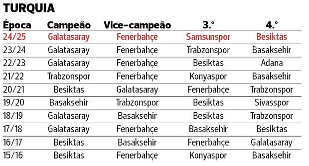 Só na Turquia e em Itália não houve equipas sempre nos quatro primeiro de 2015/2016 para cá. Besiktas (falhou em 2021/2022 e 2023/2024) e Basaksehir (2020/2021 e 2022/2023) e Juventus (2022/2023) e Inter (2016/2017) terminaram por oito vezes no top-4 da Superliga e da Serie A.
