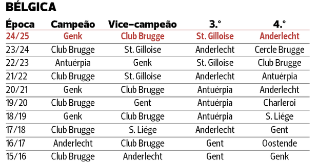 Club Brugge, Anderlecht, Genk e Antuérpia ganharam a Jupiter Pro League na última dezena de anos. O Genk parte para a segunda fase da prova com seis pontos de avanço sobre o St. Gilloise e quatro sobre o Club Brugge. Só repetindo o que fez pela última vez em 1935, a velha dama quebrará o ciclo, introduzindo um quinto campeão.