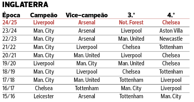 Leicester, Chelsea, Manchester City e Liverpool venceram a Premier League de 2015/2016 para cá e, esta época, os reds lideram com 14 pontos de avanço sobre o Arsenal, a nove jornadas do fim. Nada provável, pois, que haja campeão diferente dos últimos quatro. A não ser que os gunners ganhem o que não ganham desde 2003/2004.