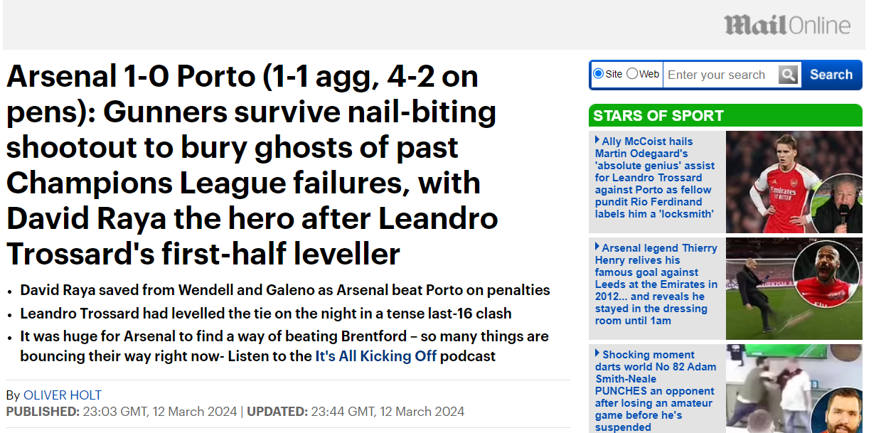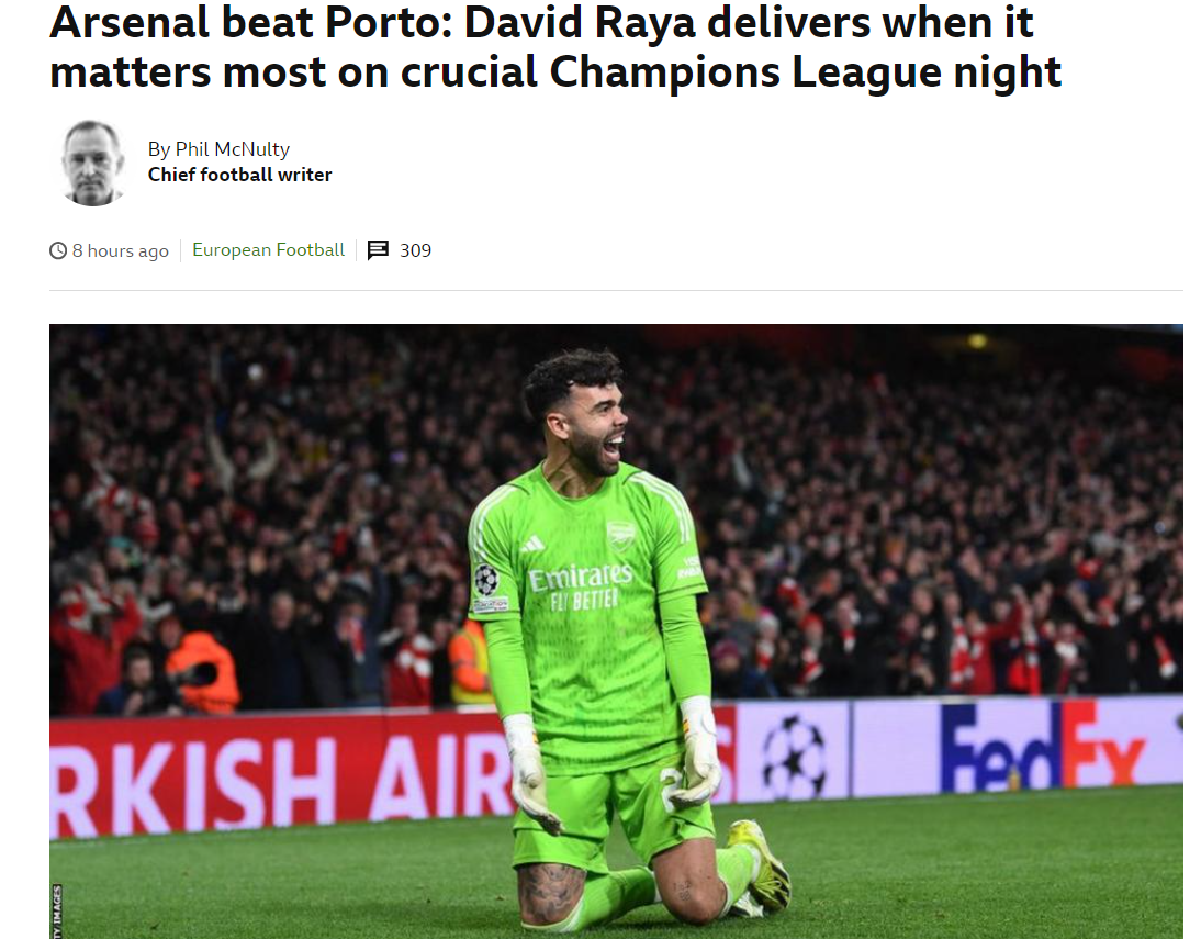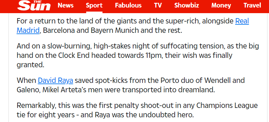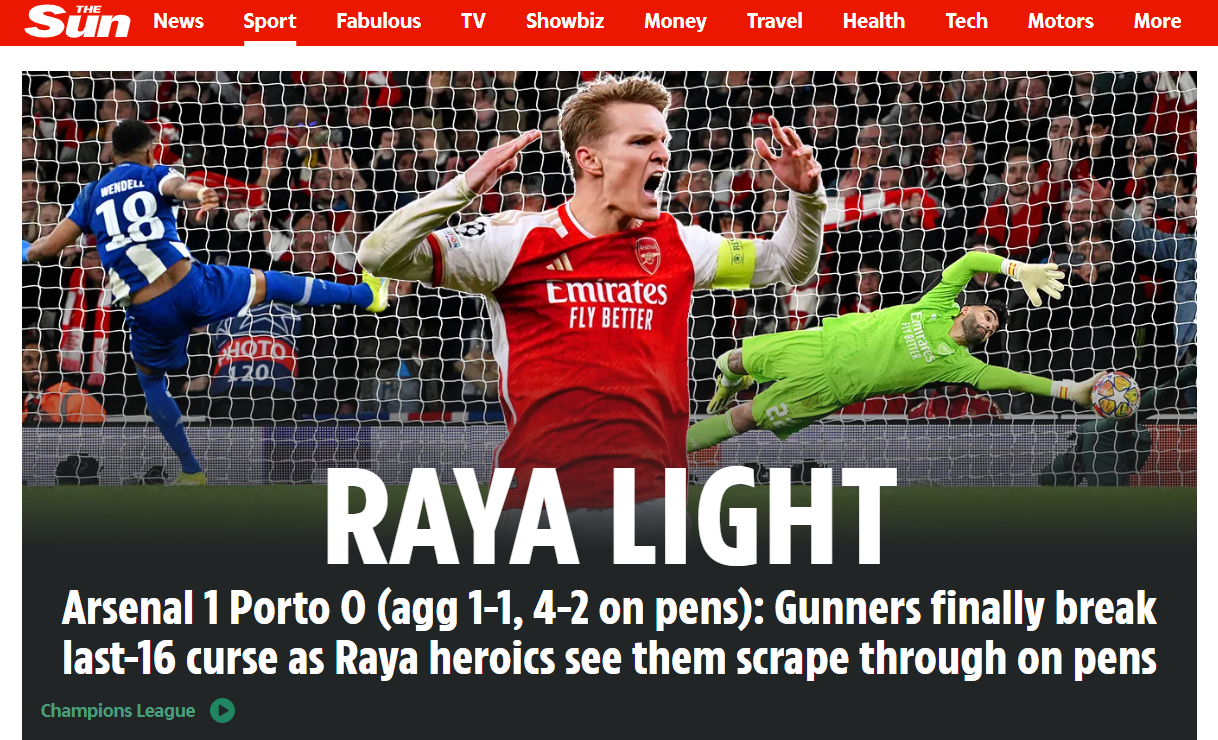 O The Sun aponta para uma «tensão sufocante», acabando David Raya por ser o «herói». O grande destaque da imprensa inglesa vai mesmo para Raya. É ainda enaltecida a passagem do Arsenal aos quartos de final após… 14 anos.