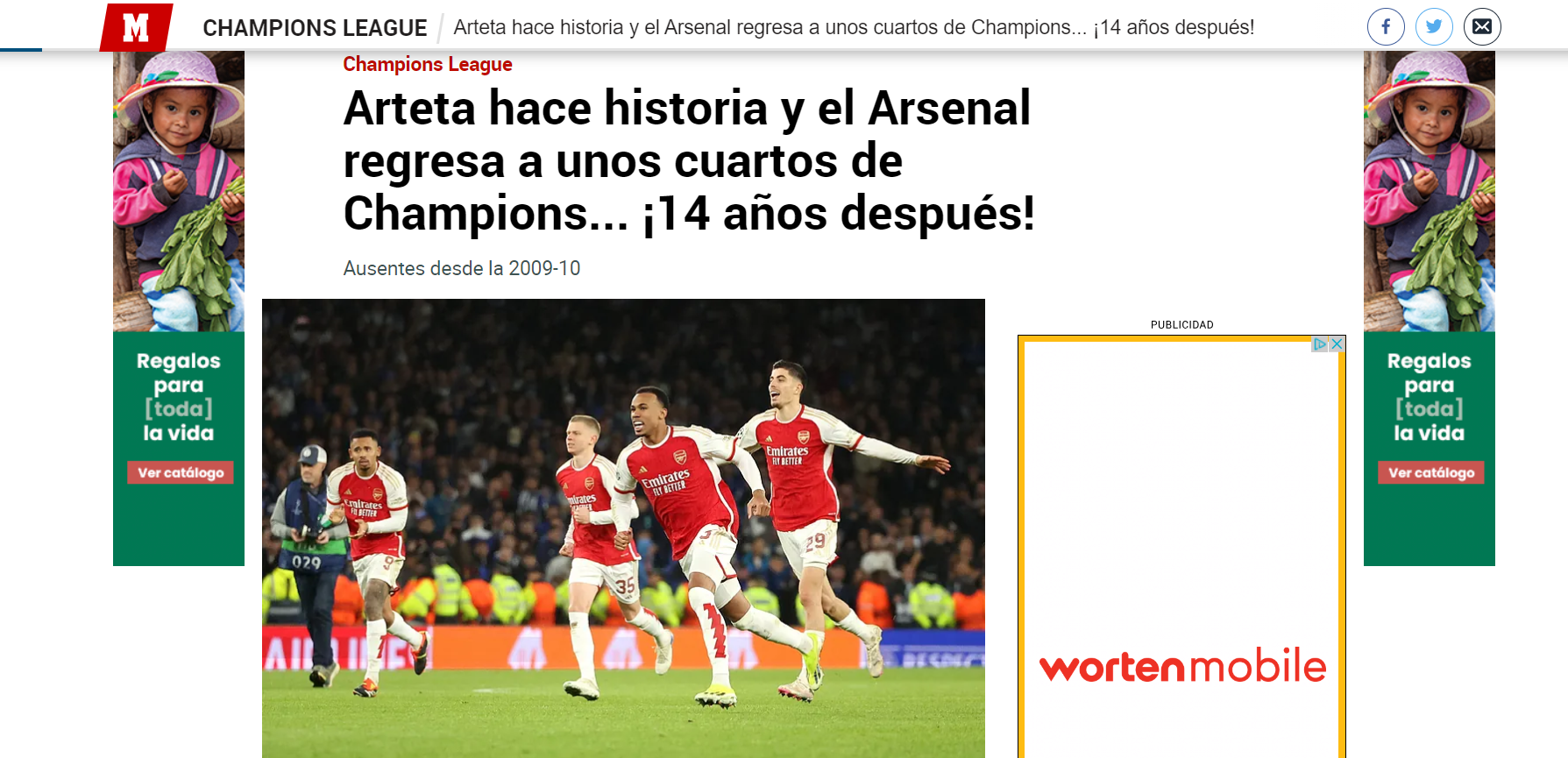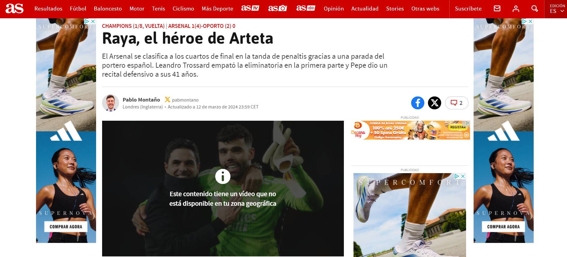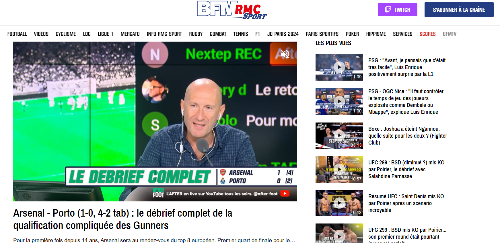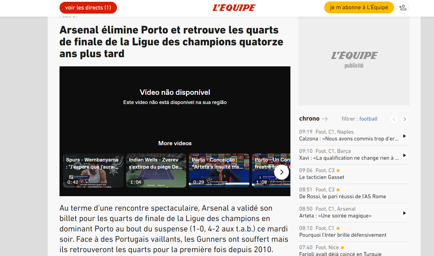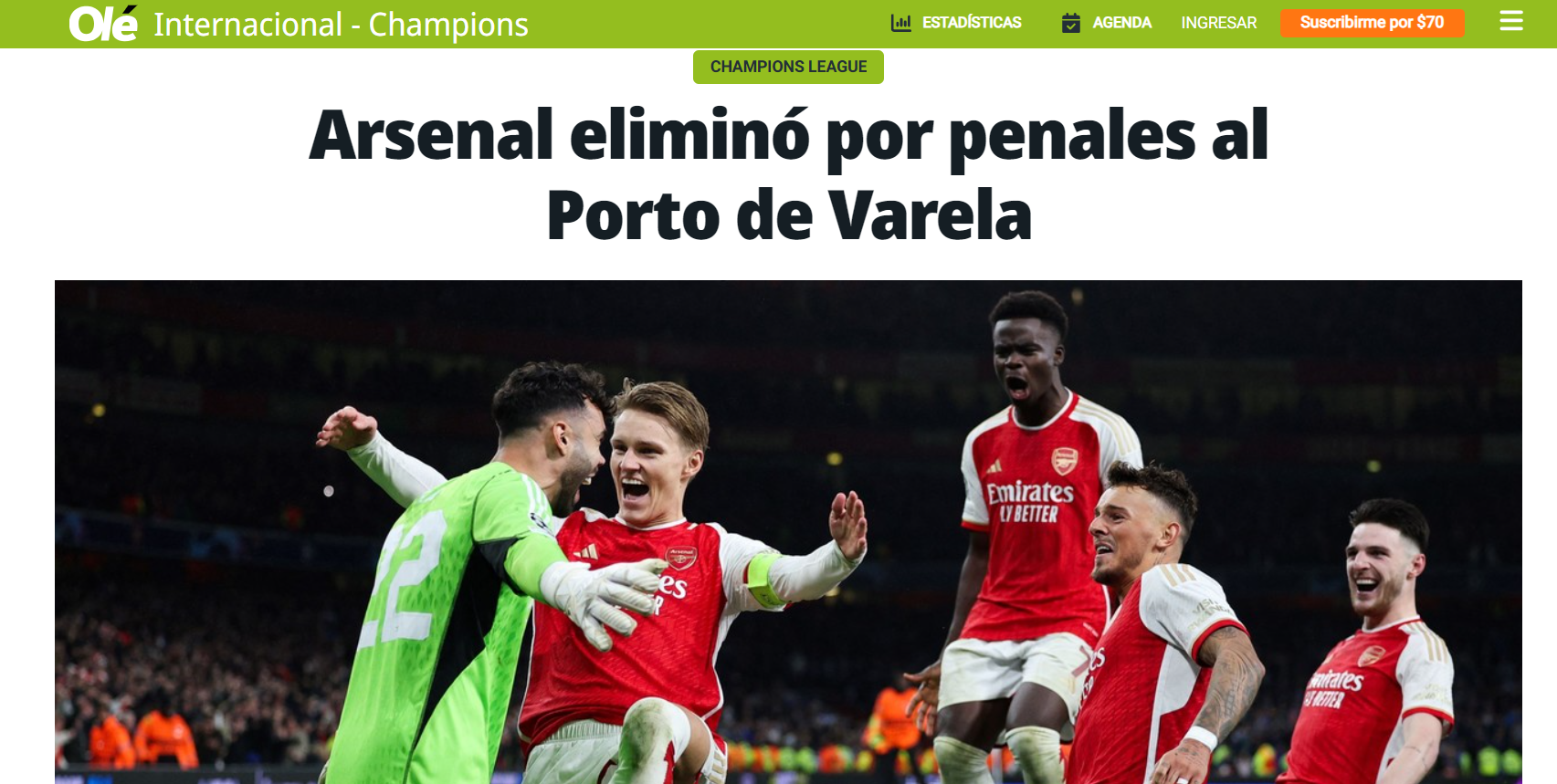 O FC Porto foi eliminado, na terça-feira, da Liga dos Campeões, pelo Arsenal, no desempate da marca das grandes penalidades, após vitória no Dragão (1-0) e derrota no Emirates (0-1). A eliminatória dos oitavos de final da liga milionária teve eco na imprensa internacional, com o L’Équipe a destacar os «portugueses valentes». Também em França, a RMC Sport fala numa qualificação «complicada» para os gunners.