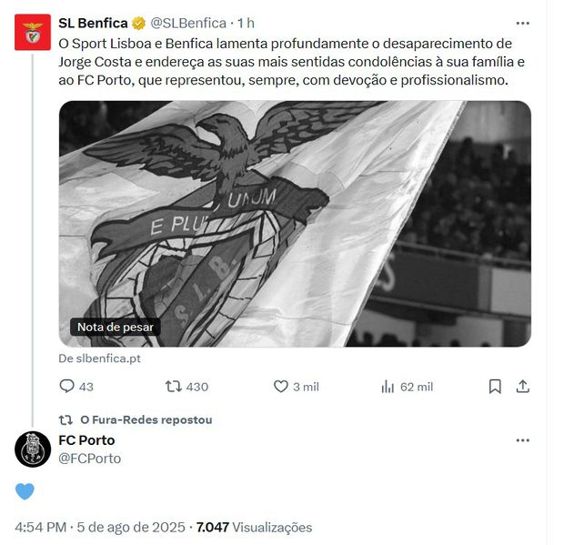 Benfica e Sporting juntaram-se às inúmeras mensagens de apoio ao FC Porto e à família e amigos de Jorge Costa, que morreu esta terça-feira aos 53 anos, vítima de uma paragem cardiorrespiratória. E o clube azul e branco fez questão de reconhecer esse gesto.