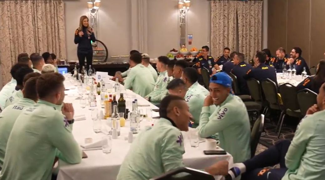 A presidente do Palmeiras, Leila Pereira, foi na semana passada chefe de delegação da seleção brasileira nos dois últimos jogos na Europa, contra Inglaterra e Espanha, e como foi a sua estreia, teve de passar pela tradicional praxe, como acontece com os jogadores.