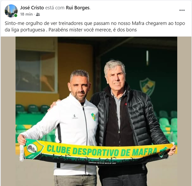 Rui Borges, que orientou o clube mafrense na época 2021/2022 (cumpriu apenas 15 jogos), deixou saudades, e muitos foram aqueles que fizeram questão de lembrar o seu papel no clube apesar do curto espaço de tempo. Um deles foi curiosamente o presidente José Cristo que hoje, nas suas redes sociais, anunciou a… saída de Rui Borges.