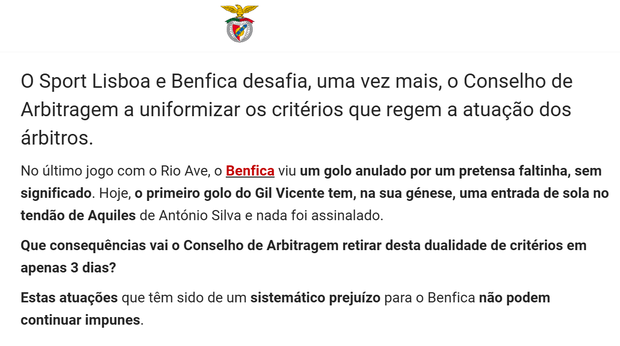 «O Sport Lisboa e Benfica desafia, uma vez mais, o Conselho de Arbitragem a uniformizar os critérios que regem a atuação dos árbitros.