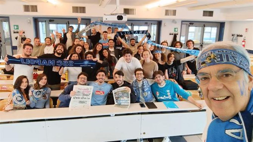 Bruno Siciliano não conteve a euforia e festejou com os seus alunos o título do Nápoles, que se sagrou campeão na quinta-feira, após 33 anos. O professor de engenharia robótica na Universidade de Nápoles Federico II levou os festejos para a sala de aula, onde celebrou com os alunos alguns dias depois