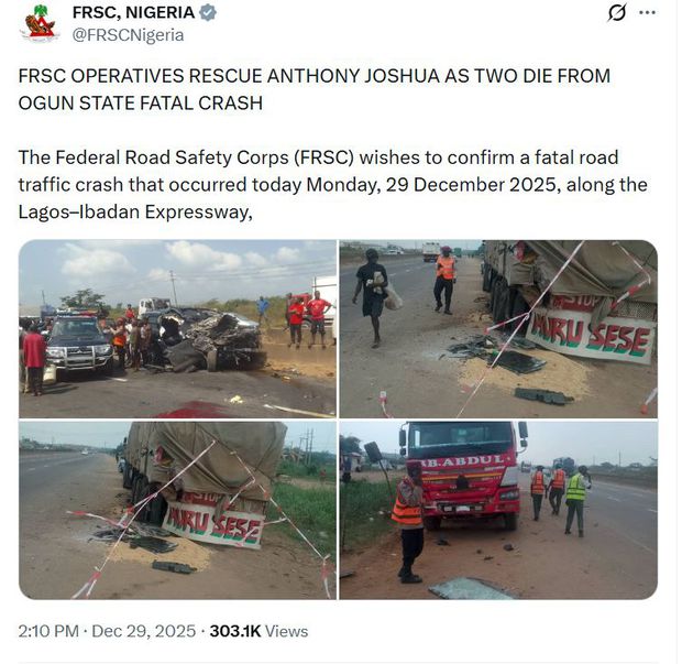 A Agência Federal de Segurança Rodoviária da Nigéria (FRSC) publicou várias fotografias do local do acidente na rede social X. As descobertas preliminares indicam que o veículo Lexus Jeep provavelmente excedeu o limite de velocidade legal. A FRSC acrescentou que o carro perdeu o controlo durante uma manobra de ultrapassagem e embateu num camião parado na berma da estrada.